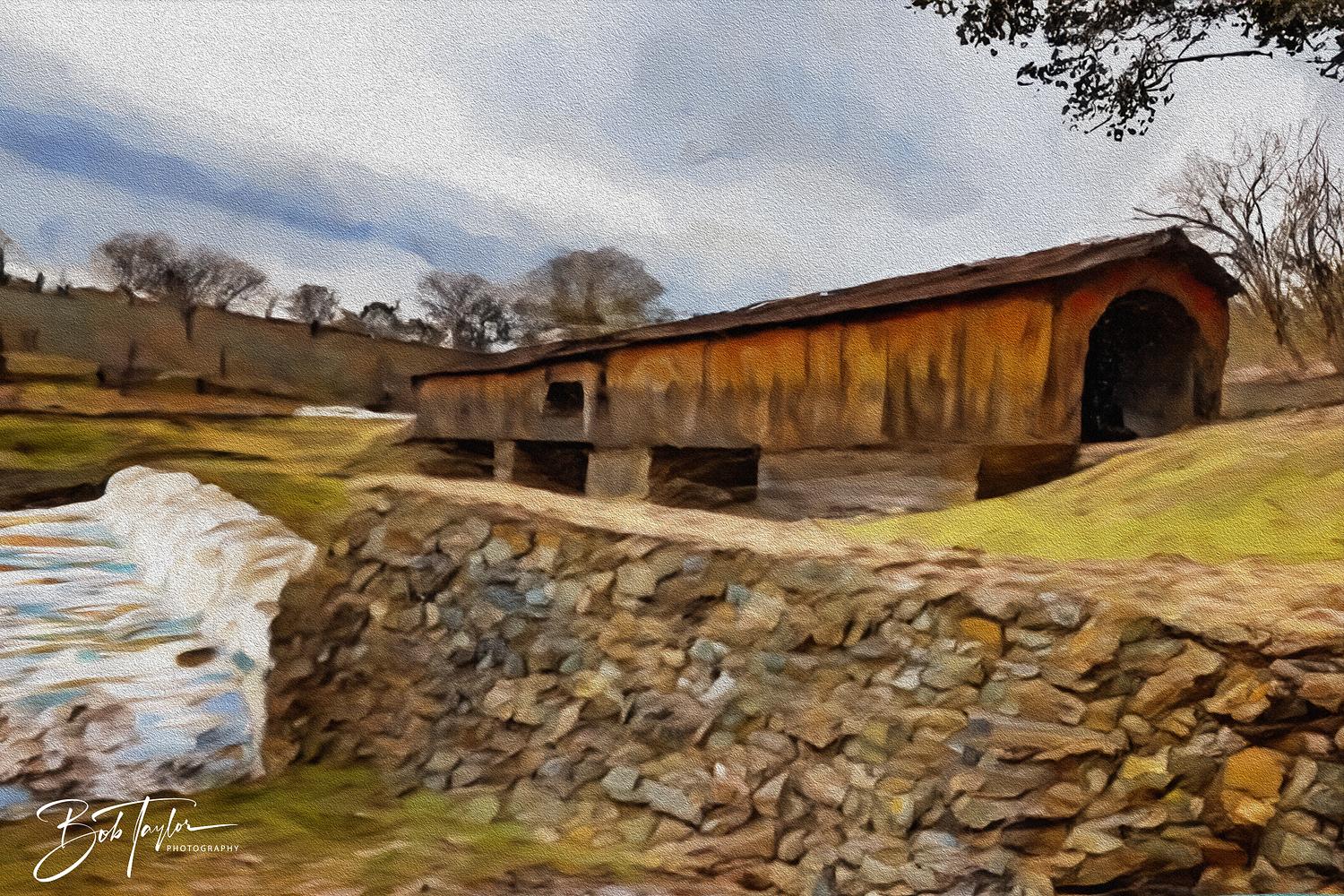 Covered Bridge at Watson Mill with waterfall and rock wall in Comer, Georgia. Artwork created from a photo taken in Feb 2024.