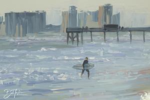 An artistic rendering of a photo I took at St Andrews State Park in Panama City Beach, Florida in 2024 of a surfer finishing up his last ride for the day.