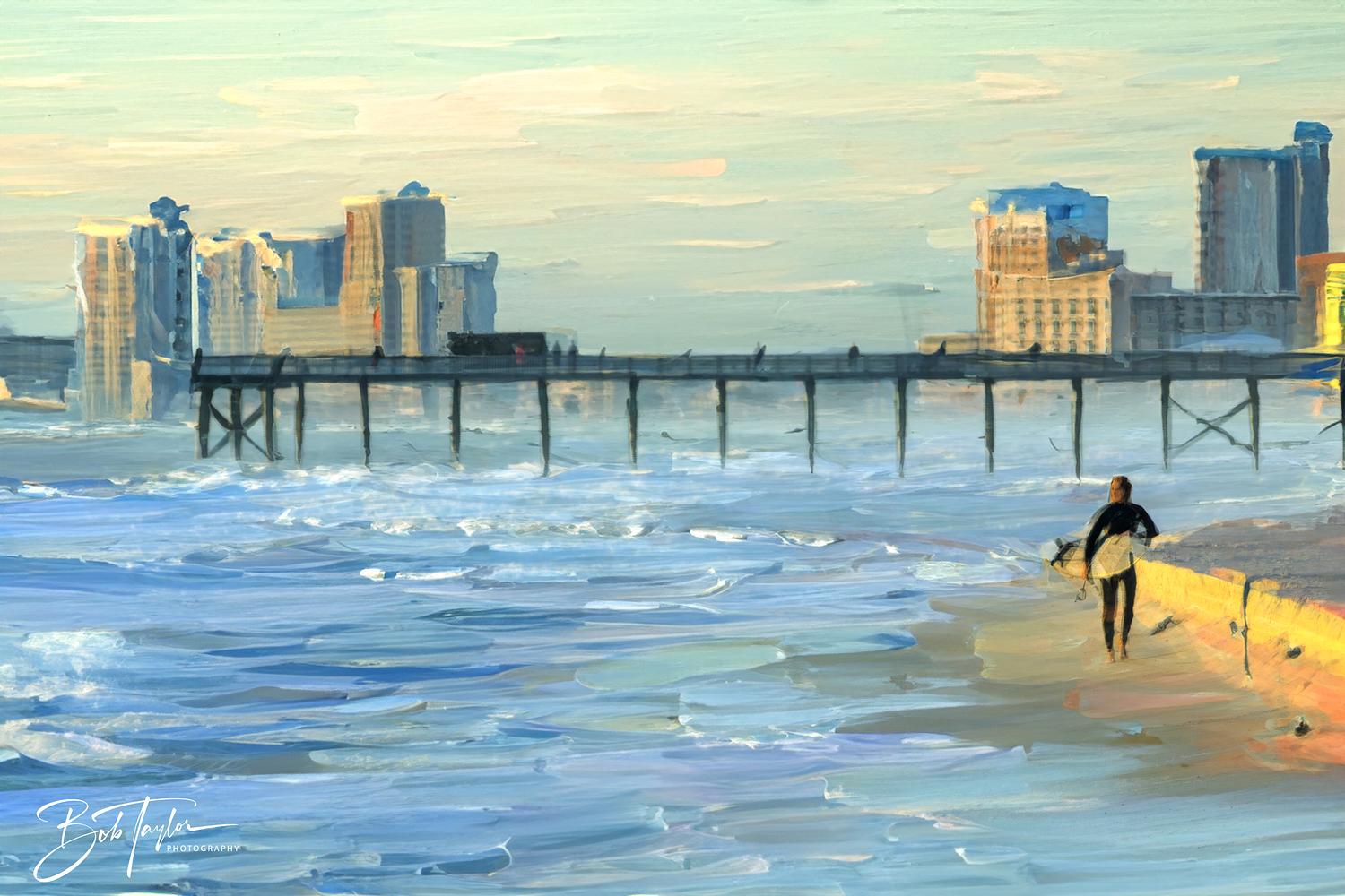 An artistic rendering of a photo I took at St Andrews State Park in Panama City Beach, Florida in 2024 of a surfer taking the long walk back from a day of surfing at sunset.