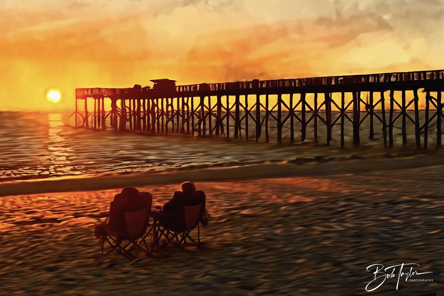 An artistic rendering of a photo I took at St Andrews State Park of a couple watching the sunset together at the gulf side pier.